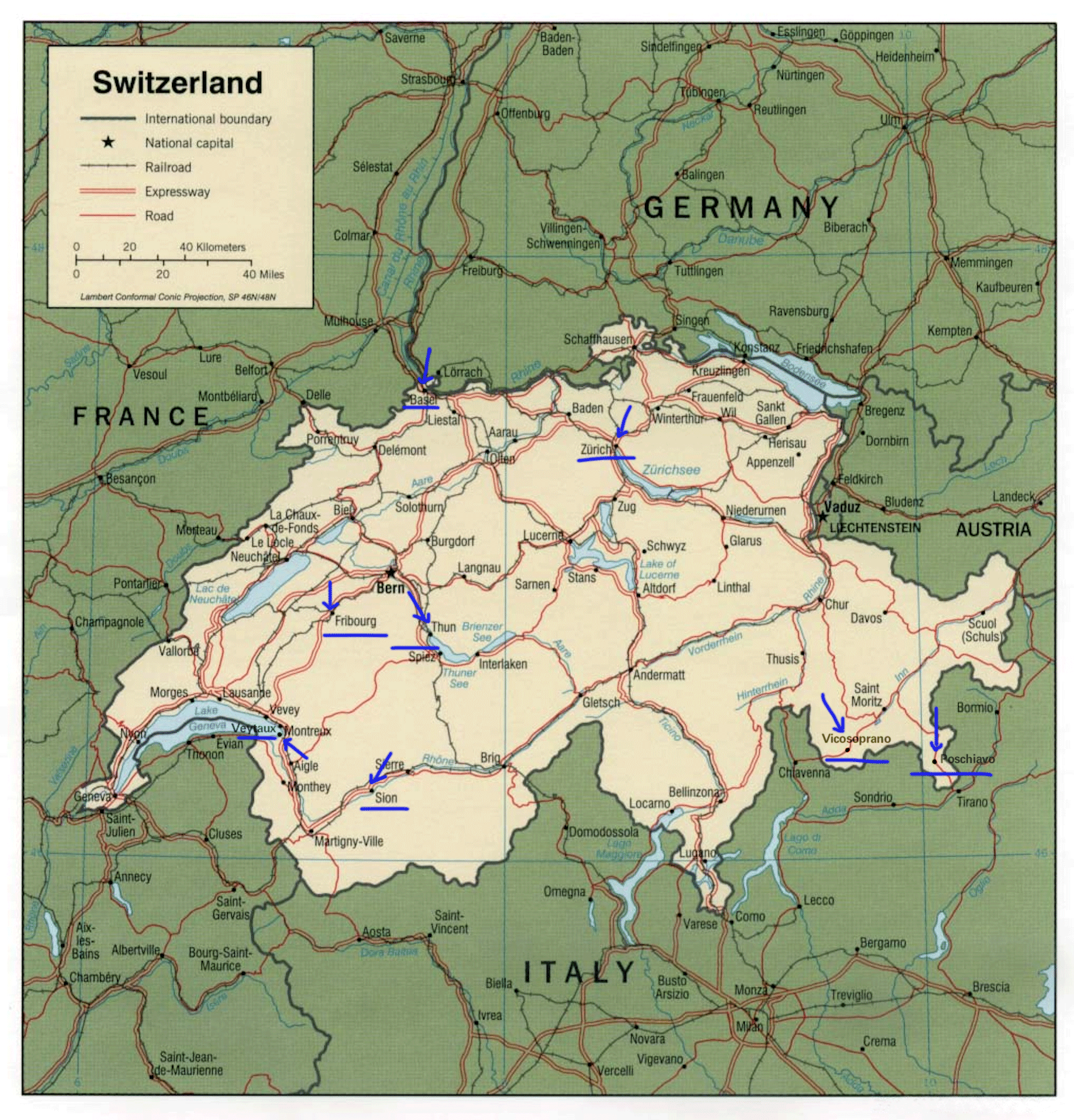 Schweizer VerkehrswegeMap of Switzerland with the marked locations I have visited so far. Source: MyGeo.info, Public Domain