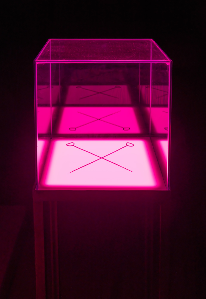 Installation consisting of 5 Volcas, audioreactive EL-Wires, a mixer, speakers, wood and plexiglas. Installation views during ‚9 espaces distincs‘ at Kunsthaus Langenthal, 2020. Courtesy KhL. Photo: CE